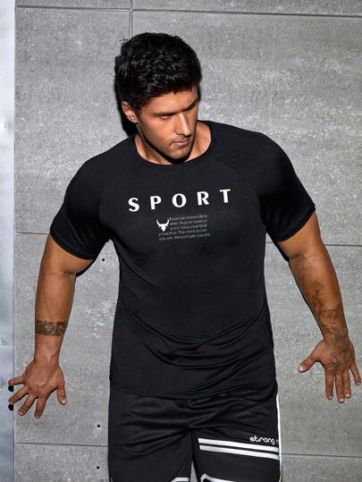 Manfinity Sport Corelite 男士口號圖案拉格蘭袖運動T恤,運動上衣 - 黑色 - 查看 1