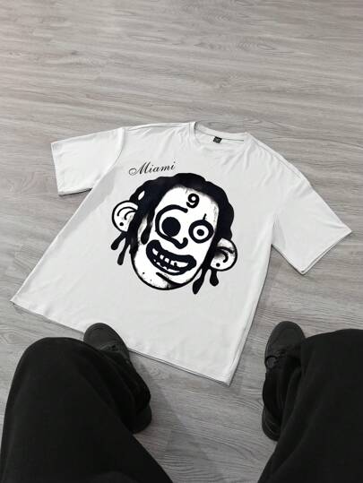 Manfinity EMRG 男士 T 恤,男士青春街头风格卡通图案印花宽松白色短袖 T 恤,正反面双面图案印花,图案 T 恤,趣味 T 恤,白色男士 T 恤 - 白色 - 查看 1