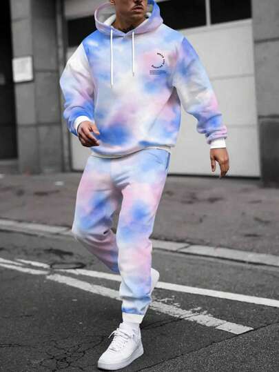男士紮染和標語圖案保暖抽繩連帽衫和運動褲