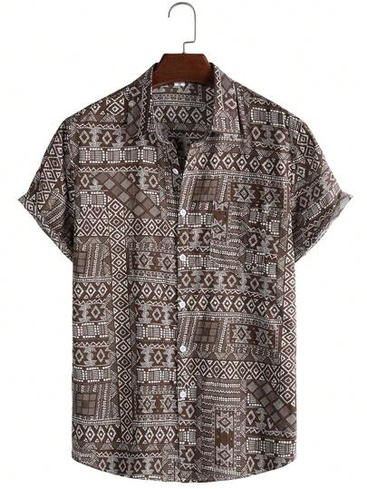 男士纽扣印花休闲短袖衬衫 - 咖啡棕 - 查看 1