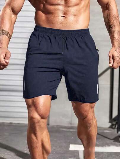 男士休闲运动短裤,带隐藏口袋、拉链、反光条纹、印花设计、透气健身短裤、户外沙滩短裤 - 藍色 - 查看 1