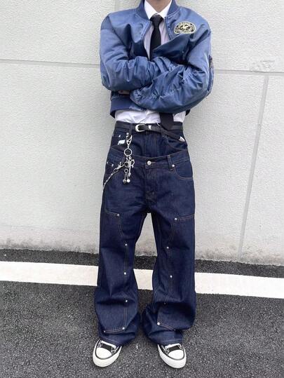 Men's Double Waist Head Colliding Loose Straight Leg Jeans Versatile Wide Leg Casual Lazy Style Jeans
