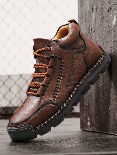 男士手工高帮休闲鞋,时尚系带超纤皮运动鞋,适合秋冬日常穿着,户外徒步,舒适透气防滑锈棕色,大码45 46 47 48 - 鏽棕色 - 查看 1