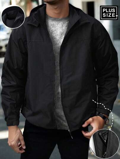 男士轻便休闲连帽拉链夹克,带口袋,防风,适合秋冬季节 - 黑色 - 查看 9