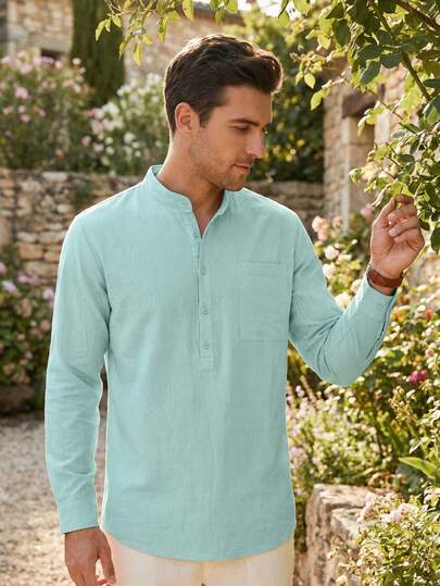男士亚麻休闲亨利领长袖衬衫,复古通勤风,夏季