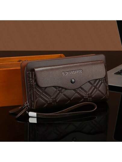 男士长款商务钱包,便携式手拿包,大容量双拉链手提包,多卡槽,手机袋,菱形设计,PU材质 - 棕色 - 查看 1