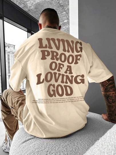 Manfinity Dauomo 男款寬鬆超大號落肩t恤,標語印花款 - 杏色 - 查看 1