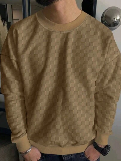 男士格紋圓領下肩t恤 - 卡其色 - 查看 1