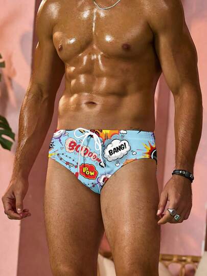 男士印花海滩度假三角泳裤,带有水果、植物和动物图案,独特、精致、性感、舒适三角裤 - 藍色 - 查看 1