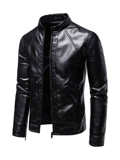 男士春秋新款摩托车皮夹克外套,羊毛 - 黑色 - 查看 1