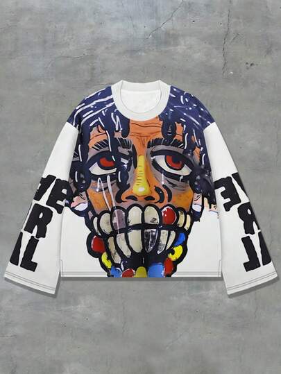 男士 T 恤,时尚涂鸦咬合 3D 印花宽松喇叭袖圆领长袖 T 恤,街头休闲运动户外装,秋季 - 白色 - 查看 3