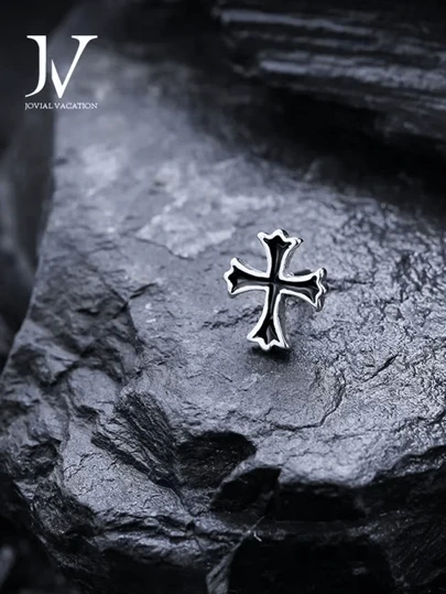 男士钛钢耳环,十字架设计,暗黑风格男士耳环 - 銀色 - 查看 1