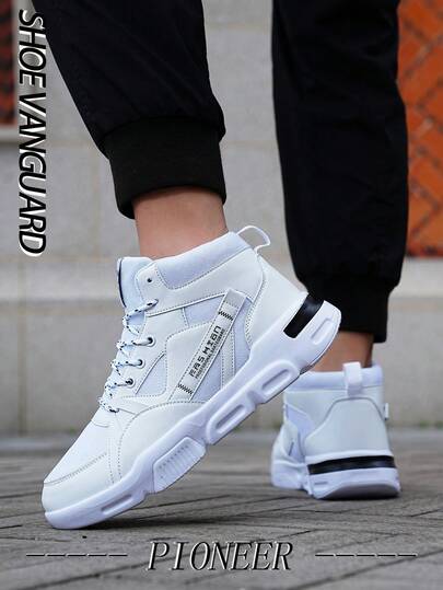 男士潮流前綁帶設計運動鞋,帶字母圖案,高筒滑板鞋適用於戶外活動和保暖 - 白色 - 查看 1