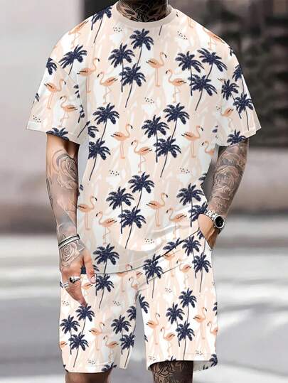 男士复古风椰子树印花 T 恤和短裤套装 - 舒适涤纶,可机洗 - 夏季完美选择,Hasna 精选 - 彩色 - 查看 1