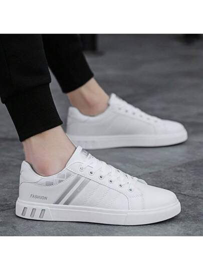 Mens Fashion Color Blocking Stripe Low Top Sneakers, Non-Slip Wear-Resistant, Breathable Lightweight Comfortable PVC Lace-Up Design Casual Sports Shoes Men - 白色 - 查看 1