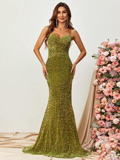 魚尾裙下擺亮片吊帶正式洋裝 - 綠色 - 查看 1
