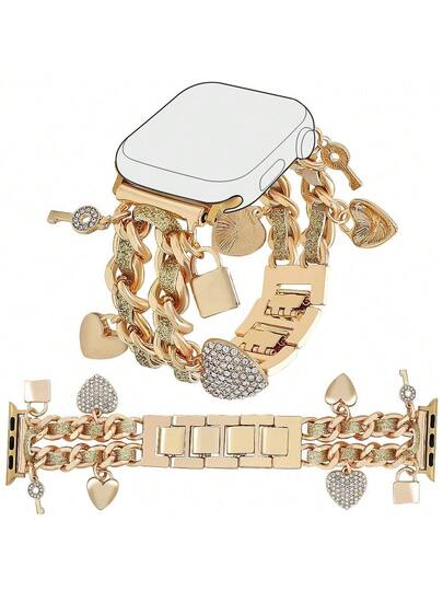 金属钥匙扣表带,兼容 49/46/45/44/42/41/40/38mm 表带,女士时尚心形链条搭配可爱吊坠,优雅腕带,适用于 Series 10 Ultra 2 9 8 7 6 5 4 3 2 SE - 金色鑰匙 - 查看 4