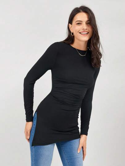 Miaspire 女式黑色天鹅绒褶皱开叉修身T恤,适合秋季女装 - 黑色 - 查看 1