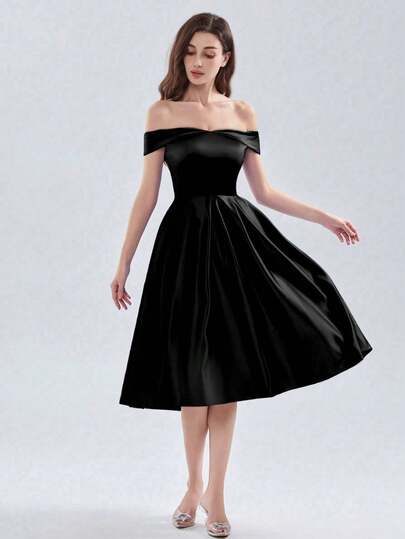 中长款舞会礼服 A 字型黑色鸡尾酒毕业礼服正式派对礼服露肩晚礼服,新娘 - 黑色 - 查看 1