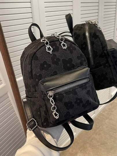 迷你時尚後背包花朵圖案學院風 - 黑色 - 查看 1