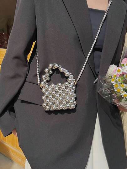 小型純色串珠手提斜背包,時尚包款適合旅行,女性適用的斜背包,高品質且易攜帶的包款,女性和女孩外出必備的斜背包 - 銀色 - 查看 1