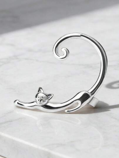 极简3D猫咪耳环,可爱卡通动物耳环,百搭日常休闲耳环 - 銀色 - 查看 5