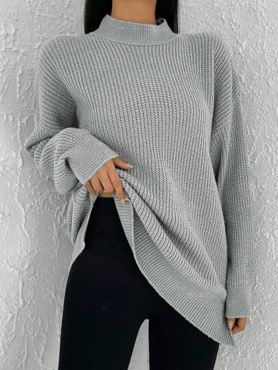 RueChic 小高領落肩袖套頭毛衣 - 灰色 - 查看 1