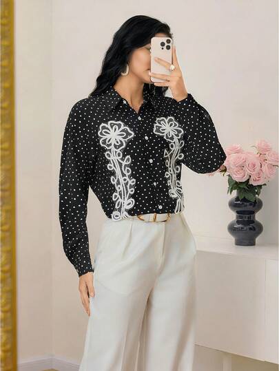 Modelyn 时尚新款波点刺绣黑色女式衬衫 - 黑色 - 查看 1