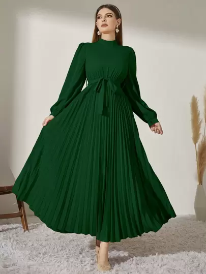Modelyn 小高領燈籠袖百褶下擺繫腰帶連衣裙 - 墨綠色 - 查看 1