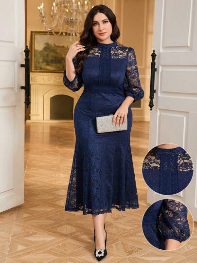 Modelyn 大码女式蕾丝拼接鱼尾下摆优雅连衣裙 - 藏蓝色 - 查看 1