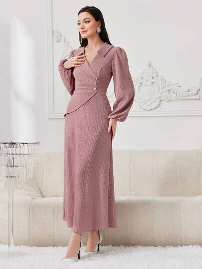 Modelyn 女士洋袖和褶皺細節的阿拉伯風格連衣裙
