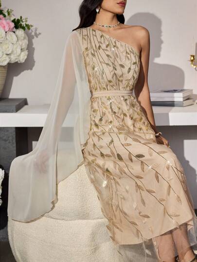 Modelyn 女式奢华花卉亮片装饰雪纺连衣裙 - 杏色 - 查看 1