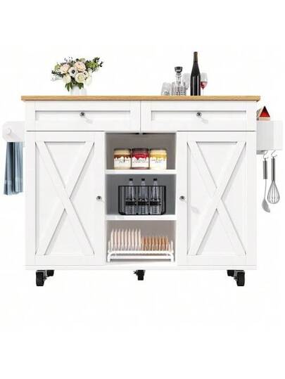 Modern Kitchen Island, Kitchen Cabinet, Sideboard, Serving Cart With Wood Finish, Multifunctional Dining Table With Storage, Serving Cart With Snack Shelves, White - 白色 - 查看 1
