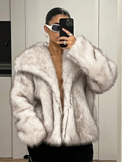 SHEIN ICON 女士冬季翻领前开襟蓬松夹克 - 灰色 - 查看 1
