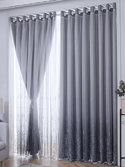 1 件简约风格植物刺绣遮光客厅窗帘 - 灰色 - 查看 1