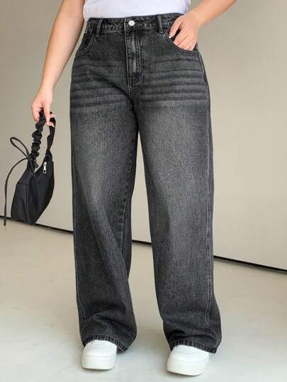 Dazy Petite Plus 大尺碼女裝時尚寬鬆牛仔寬腿褲 - 黑色 - 查看 1