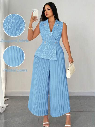 SHEIN Unity 女士加大码优雅提花褶皱立领连体裤 - 藍色 - 查看 1