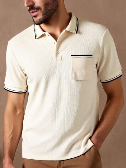 Manfinity VCAY 男士休闲针织条纹平领短袖Polo衫 - 杏色 - 查看 6