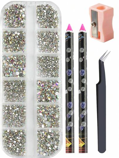多尺寸AB水晶指甲鑽石套裝,帶平底透明鑽石和DIY指甲藝術裝飾,附有指甲筆、鑷子、指甲吊飾及指甲用品套組 - 彩色 - 查看 1