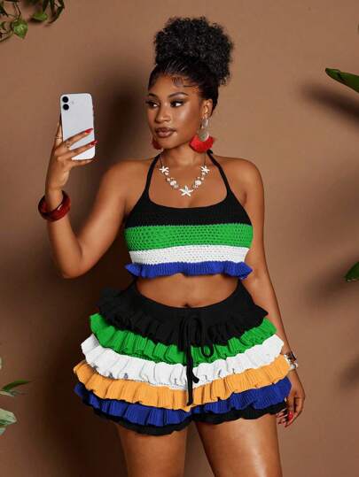 Maweii 大码女式纯色丝带镂空海滩度假性感两件套海滩女士服装夏季女士服装波西米亚风 - 彩色 - 查看 6