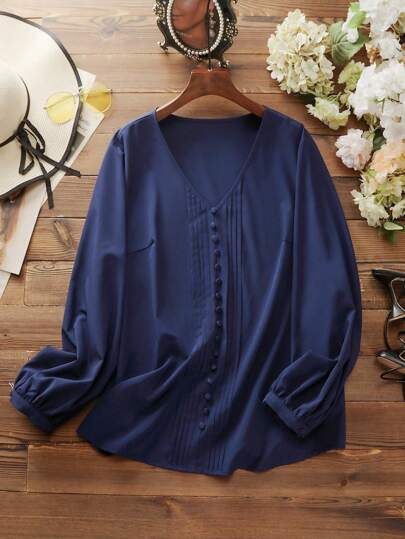 Mulvari 大碼前紐扣燈籠袖襯衫 - 藏蓝色 - 查看 1