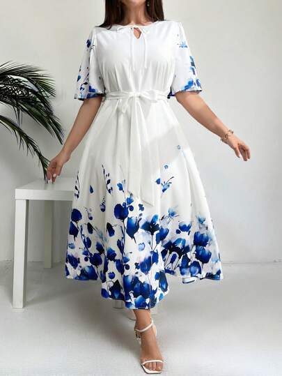Mulvari Plus碼花卉印花綁領腰帶連衣裙 - 白色 - 查看 1