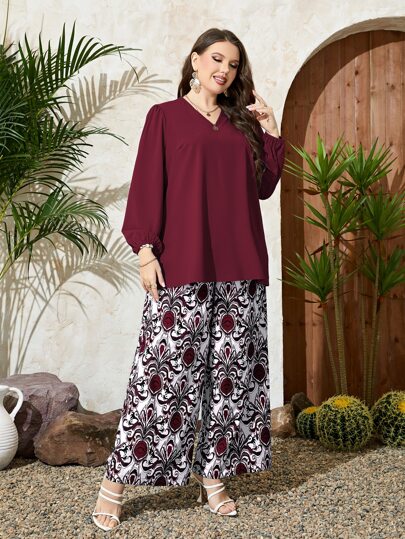 Mulvari 加上灯笼袖衬衫和全印花裤两件套 - 紅白色 - 查看 1