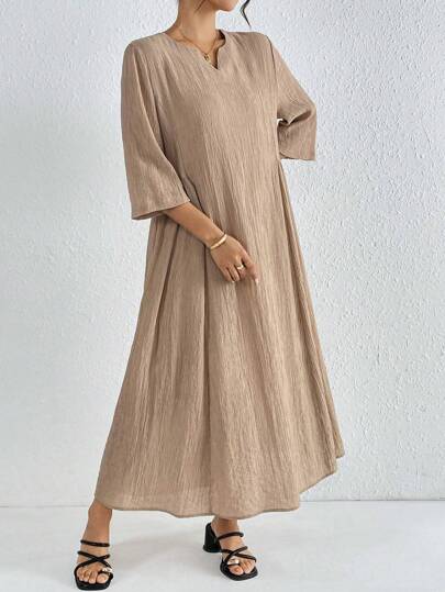 Mulvari 女士纯色缺口领休闲日常朴素连衣裙 - 咖啡 - 查看 1