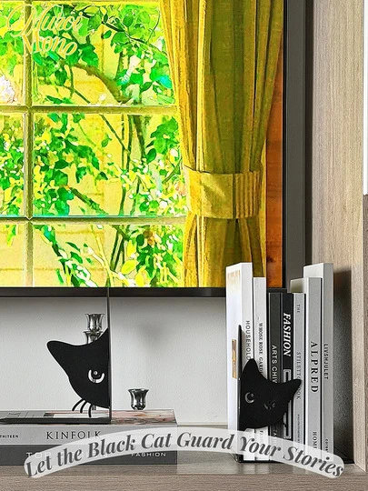 Muroi Mono 2 件铁猫形书挡,重型金属书桌书挡,带有奇思妙想的猫咪图案,带圆角的装饰性书挡,书夹,适用于办公室、图书馆、书架、书桌装饰 - 黑色 - 查看 11
