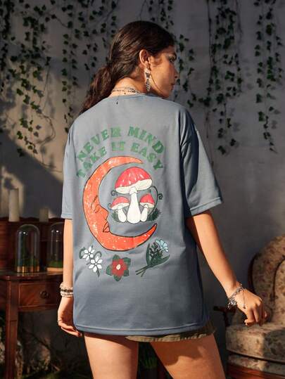 蘑菇和標語圖案落肩T恤 - 霧霾藍 - 查看 2