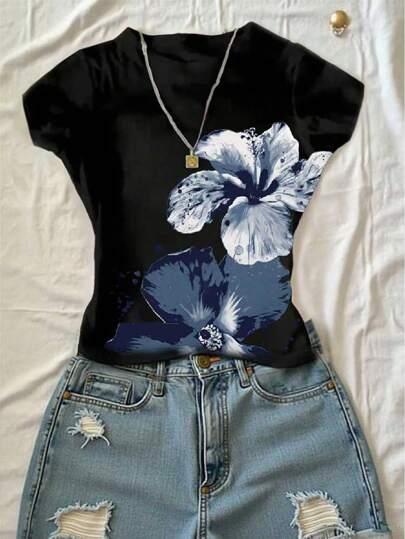 INAWLY 女士休闲花卉印花短袖T恤,夏季 - 黑色 - 查看 1