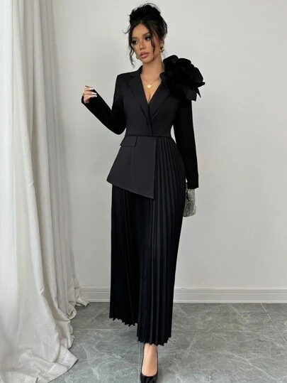 Rafferiza 1 件女式优雅黑色长袖翻领花卉装饰不对称口袋盖设计褶皱下摆连衣裙长款女装 - 黑色 - 查看 1