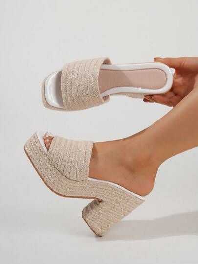 女士繩繩楔形平台涼鞋,開放式趾夾帶夏日休閒高跟拖鞋 - 杏色 - 查看 1