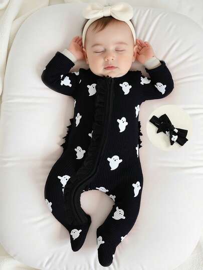 My First Halloween Baby Girl Outfit Romper Ruffles Ghost Print Zipper Long Sleeves Jumpsuits Cute Clothes